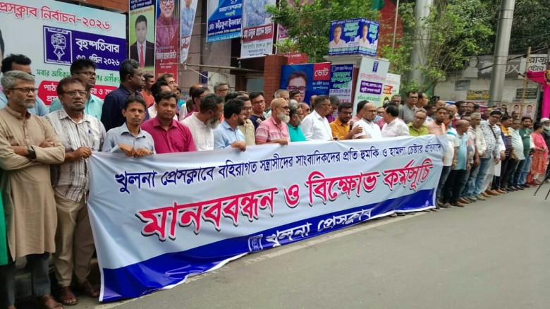 খুলনা প্রেসক্লাব চত্বরে বহিরাগত সন্ত্রাসীদের দ্বারা সাংবাদিকদের লাঞ্ছিত করার ঘটনায় মানববন্ধন ও বিক্ষোভ কর্মসূচি পালন করেছে কর্মরত সাংবাদিকরা।